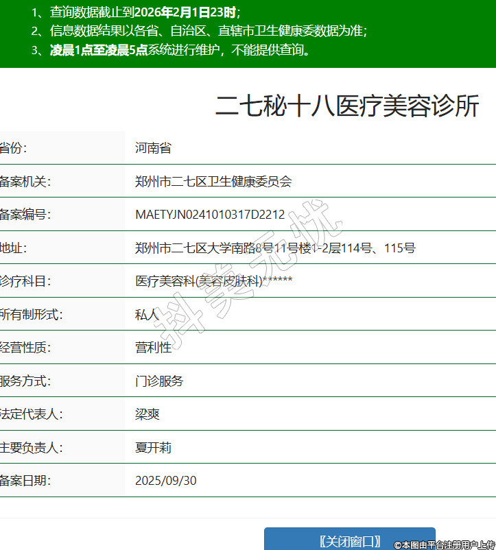 省份:河南省備案機(jī)關(guān):鄭州市二七區(qū)衛(wèi)生健康委員會(huì)備案編號(hào):MAETYJN0241010317D2212地址:鄭州市二七區(qū)大學(xué)南路8號(hào)11號(hào)樓1-2層114號(hào)、115號(hào)診療科目:醫(yī)療美容科(美容皮膚科)******所有制形式:私人經(jīng)營(yíng)性質(zhì):營(yíng)利性服務(wù)方式:門診服務(wù)法定代表人:梁爽主要負(fù)責(zé)人:夏開莉備案日期:2025/09/30 -
