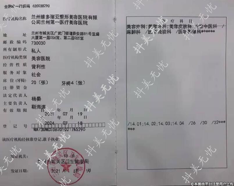 醫(yī)療機(jī)構(gòu)名稱:蘭州維多麗亞整形美容醫(yī)院有限公司蘭州第一醫(yī)療美容醫(yī)院