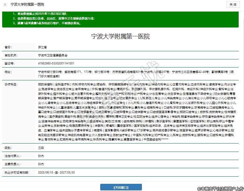 寧波市柳汀街59號(hào);解放南路171、173號(hào);柳汀街36號(hào);方橋街道機(jī)場(chǎng)南路601號(hào);寧波市人民路247號(hào);寧波市江北區(qū)揚(yáng)善路42-46號(hào);鄞慈鎮(zhèn)路6號(hào)(限門(mén)診大樓改造期)