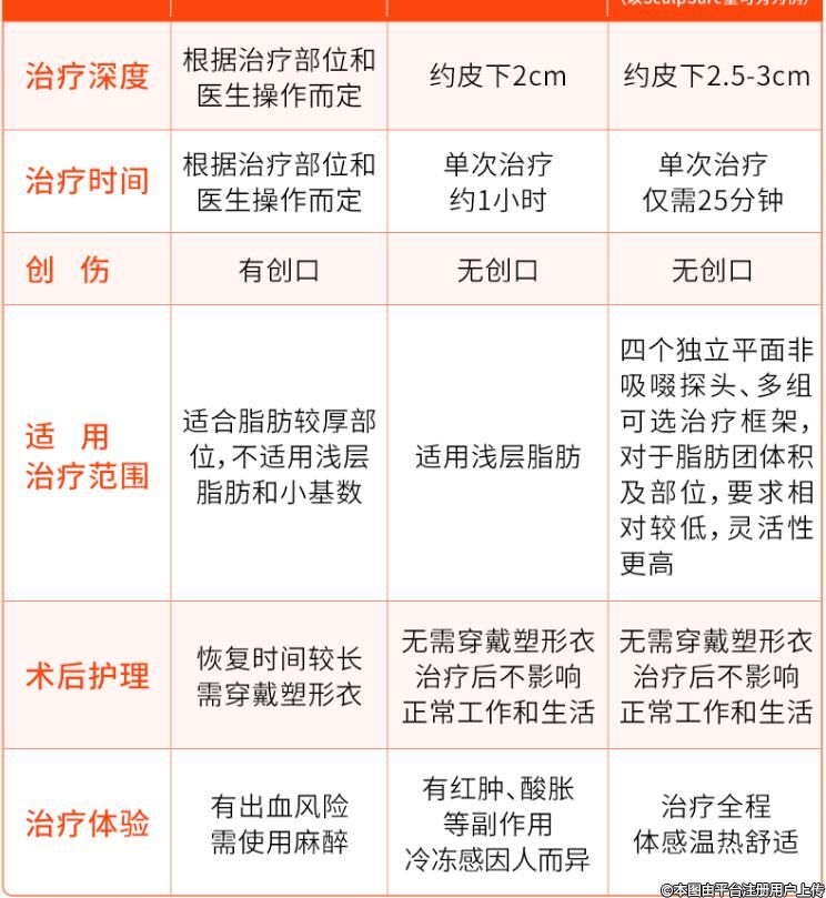但目前制霸第一梯隊(duì)的還是吸脂手術(shù)、冷凍溶脂、激光熱溶脂三大技術(shù)。