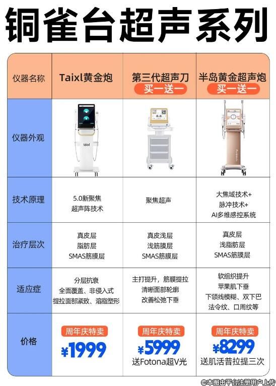 除了超聲炮,銅雀臺(tái)超聲系列抗衰價(jià)格也是很香的哦。Taixl黃金炮1999元,第三代超聲刀/黃金超聲炮買一送一。