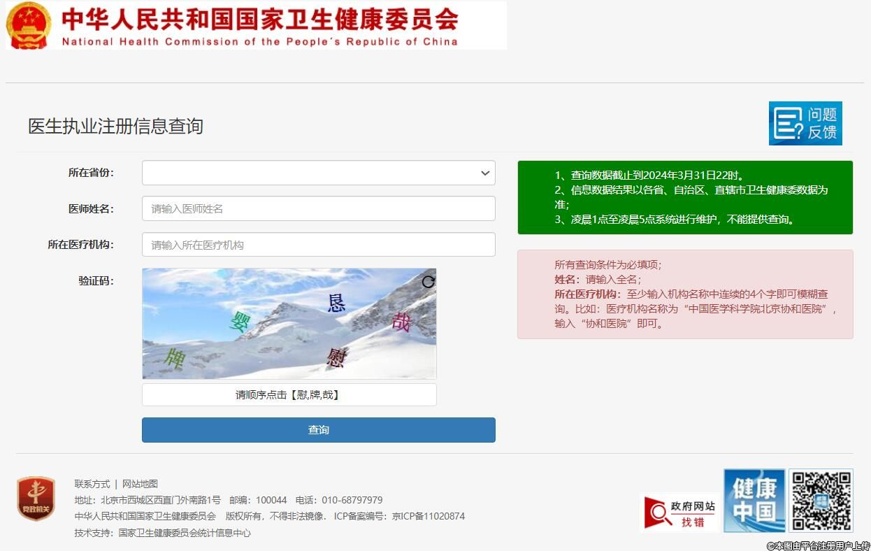 【快捷方法】點擊網(wǎng)址進入國家衛(wèi)健委官網(wǎng)(醫(yī)生執(zhí)業(yè)注冊信息查詢):http://zgcx.nhc.gov.cn:9090/Doctor