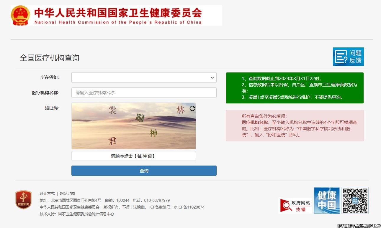【快捷方法】點擊網(wǎng)址進入國家衛(wèi)健委官網(wǎng)(全國醫(yī)療機構(gòu)查詢):http://zgcx.nhc.gov.cn:9090/unit/index