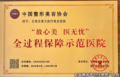 2024年4月,根據(jù)中國整形美容協(xié)會風險管理標準,經(jīng)專家審核通過,石家莊美天醫(yī)療美容醫(yī)院被授予“放心美 醫(yī)無憂”全過程保障示范醫(yī)院。中國整形美容協(xié)會醫(yī)療風險管控中心為石家莊美天發(fā)放證書。