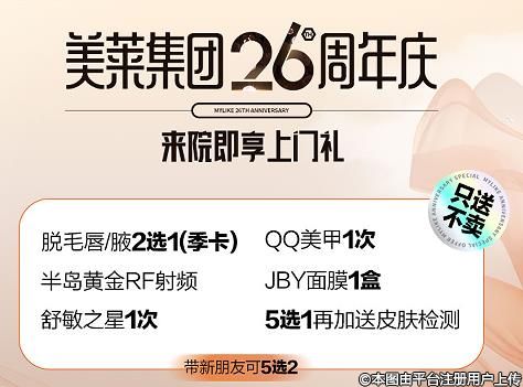 武漢美萊26周年慶優(yōu)惠福利來啦,帶朋友到院,即可享受美膚福利,五大福利可免費(fèi)選擇其中兩個,你還在等什么呢。