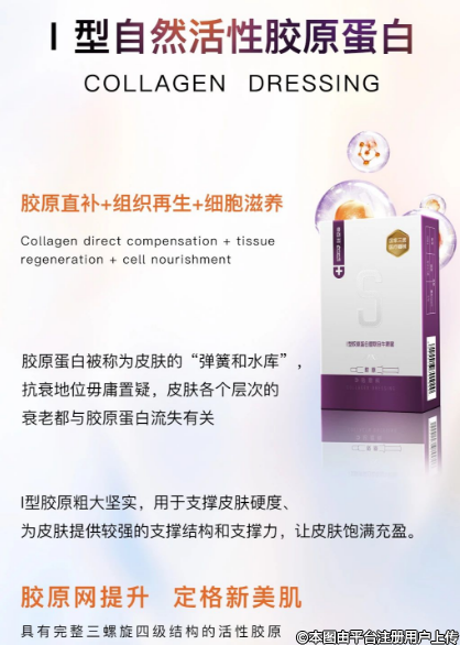 強力打樁:它的膠原結(jié)構(gòu)粗壯結(jié)實(天然三螺旋),像“鋼架”一樣直接插進皮膚塌陷處,把松垮的“床墊”重新繃緊撐平,皮膚變硬挺、嘭彈。