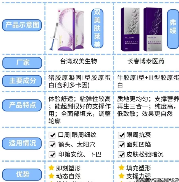 【雙美膠原蛋白】:主要用于面部凹陷填充,改善眼周狀態(tài)。其中凝固型(膚麗美)和非凝固型(膚柔美)在質(zhì)地和用途上略有不同。